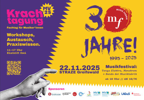 Ab 18 Uhr wird’s laut: Die Musikfabrik "MuFa" Greifswald feiert ihr 30-jähriges Jubiläum – mit Livekonzerten von Tanga Elektra, Monokrom + weiteren Bands der Musikfabrik in der STRAZE.