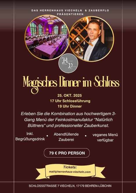 Magisches Dinner Erleben Sie ein hochwertiges 3-Gänge Menü begleitet durch unterhaltsame Zauberkunst. 17 Uhr - Führung mit den Gastgebern ab 19 Uhr Beginn (79€ inkl. Begrüßungsdrink)