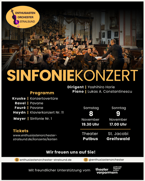 Das Enthusiastenorchester Stralsund lädt ein zum Herbstkonzert am 9. November 2025 um 17 Uhr in die St. Jacobi-Kirche zu Greifswald. Freuen können Sie sich u.a. auf eine Welt-Uraufführung: die "Konzertouvertüre" des jungen Stralsunder Komponisten Jonathan Karl Franz Kruske. Auch ein junger Virtuose wird zu hören sein: Lukas A. Constantinescu spielt das Klavierkonzert Nr. 11 von Joseph Haydn. Zum Abschluss erklingt die Sinfonie Nr. 1 von Emilie Mayer - als eine Uraufführung für Greifswald.