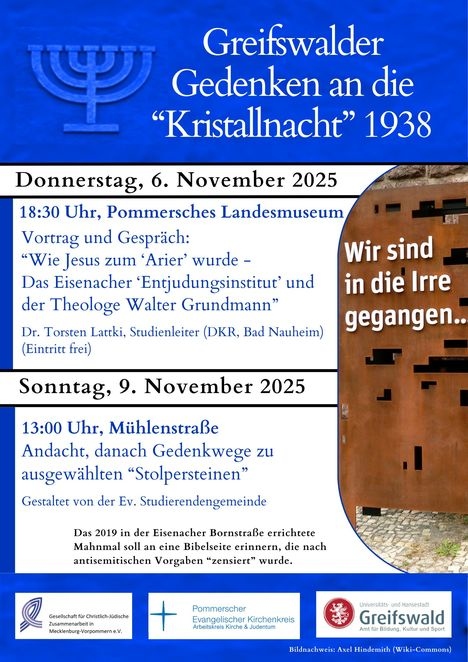 Am 6. November, um 18:30 Uhr, findet ein Vortrag zum Thema „Wie Jesus zum ‚Arier‘ wurde. Das Eisenacher ‚Entjudungsinstitut‘ und der Antisemitismus Walter Grundmanns“ statt. Dr. Torsten Lattki (Historiker und Studienleiter für interreligiösen Dialog, Bad Nauheim) wird im Pommerschen Landesmuseum referieren.