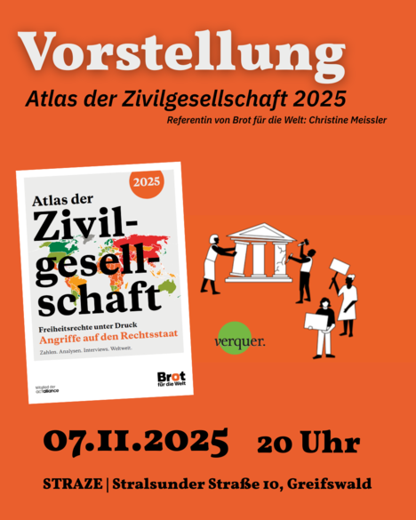 Die Veranstaltung findet statt in Zusammenarbeit mit Brot für die Welt, Entwicklungspolitische Bildungsarbeit Diakonisches Werk Mecklenburg-Vorpommern, Bildungsprojekt verquer. Vielfältige Bildung in Vorpommern, Eine-Welt-Promotor:innen-Programm Mecklenburg-Vorpommern und STRAZE Greifswald.